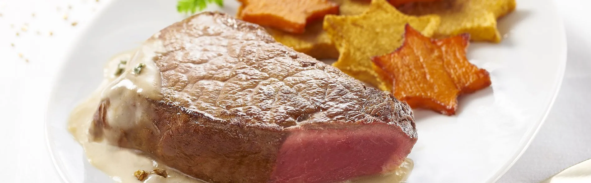 5 -Déposer les pavés de bœuf dans les assiettes, disposer les étoiles de pomme de terre et napper délicatement de sauce. C’est un délice !